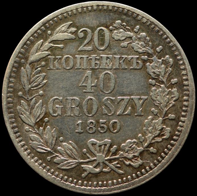 LaZooRo: Poljska pod Rusijo 20 Kopeks 40 Groszy 1850 MW XF/UNC srebro