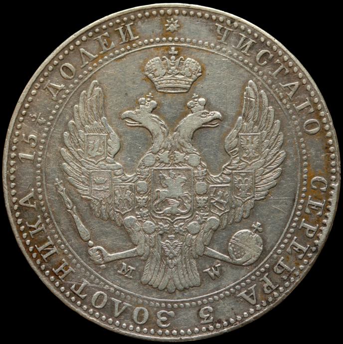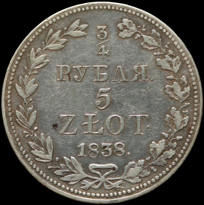 LaZooRo: Poljska pod Rusijo 3/4 Rouble 5 Zlotych 1838 MW XF / - srebro