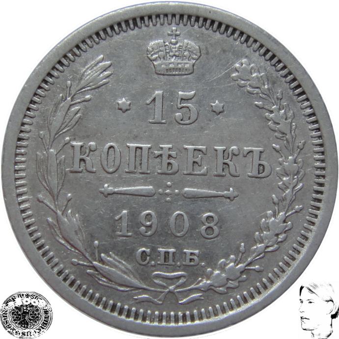 LaZooRo: Rusija 15 Kopeks 1908 XF/UNC a- Srebro
