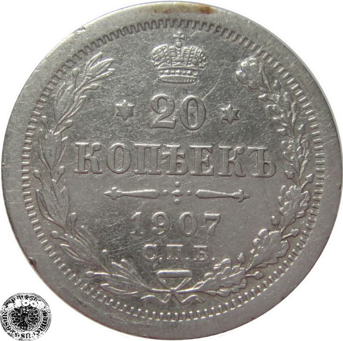 LaZooRo: Rusija 20 Kopeks 1907 VF/XF - Srebro