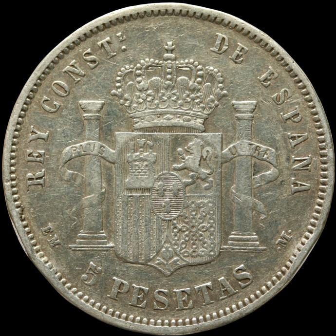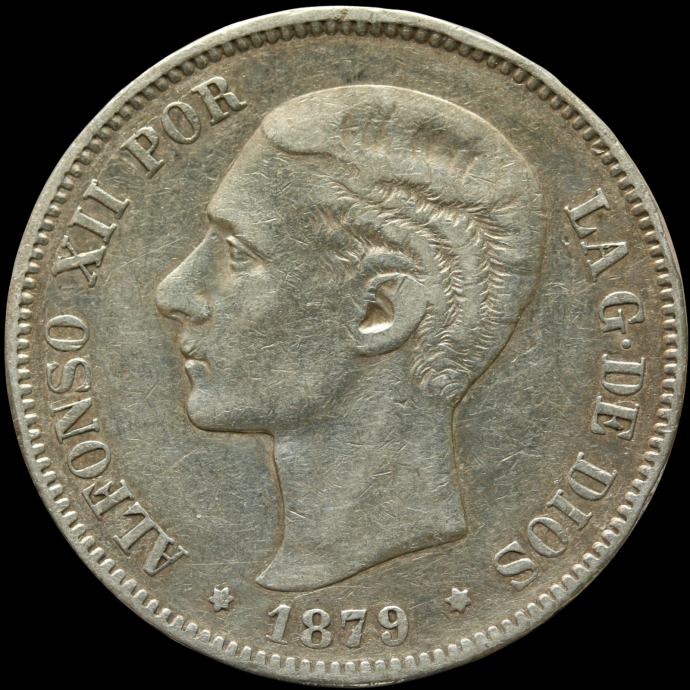 LaZooRo: Španija 5 Pesetas 1879 VF / XF - srebro
