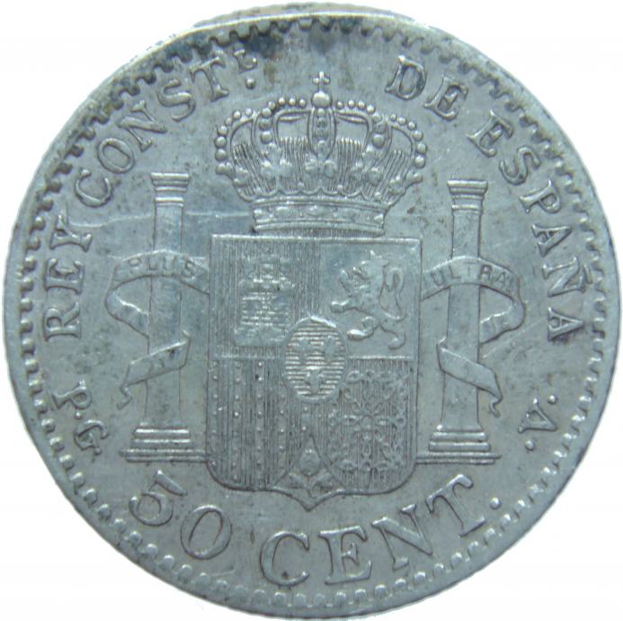 LaZooRo: Španija 50 Centimos 1896 XF redkejši - Srebro