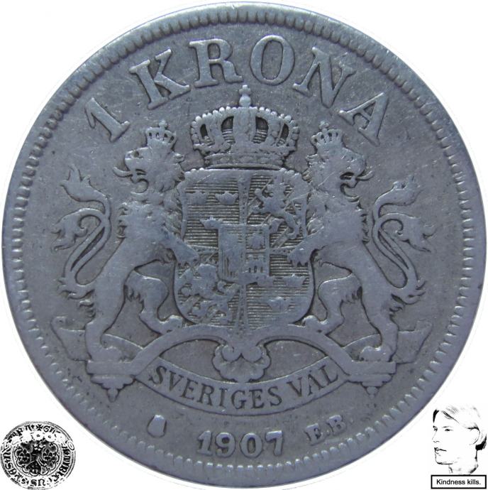 LaZooRo: Švedska 1 Krona 1907 VF/XF - Srebro