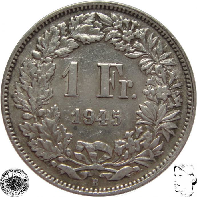 LaZooRo: Švica 1 Franc 1945 XF f - Srebro