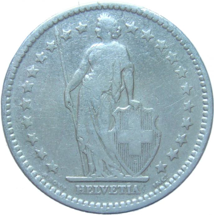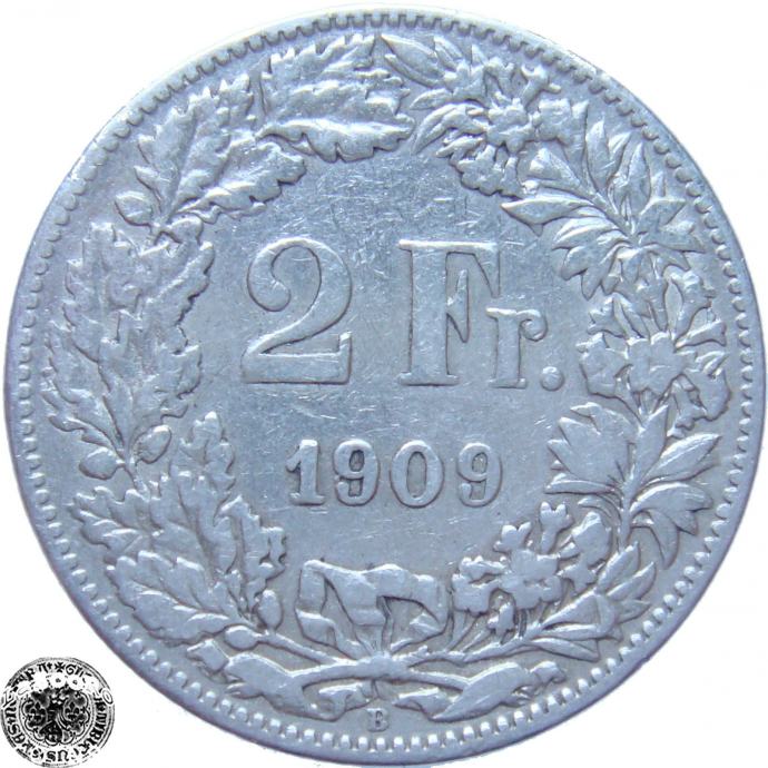 LaZooRo: Švica 2 Francs 1909 VF - Srebro