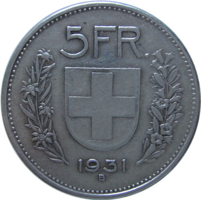 LaZooRo: Švica 5 Francs 1931 XF d - Srebro