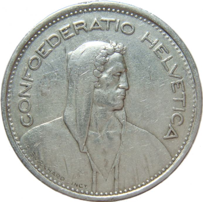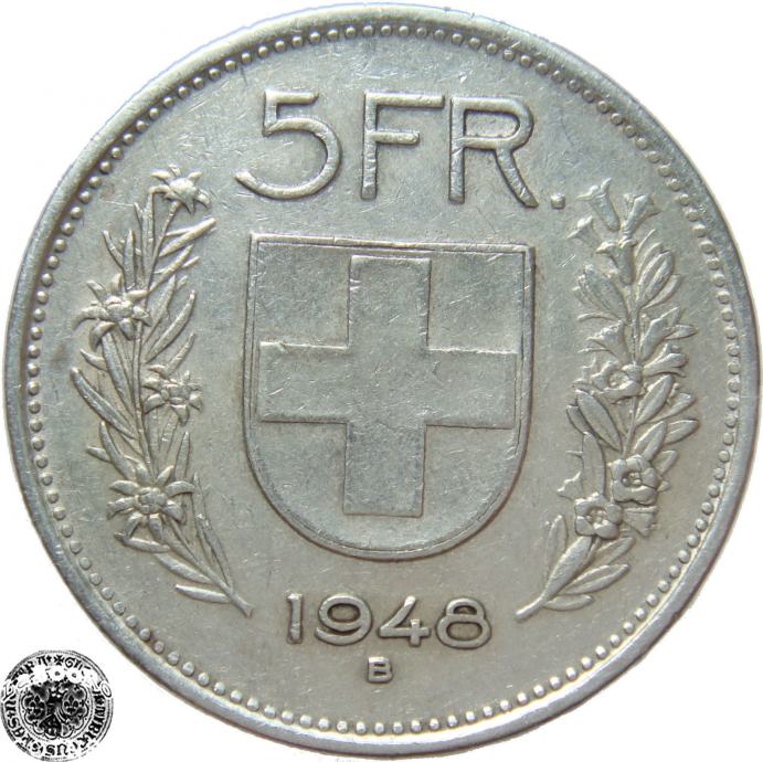 LaZooRo: Švica 5 Francs 1948 VF/XF a - Srebro