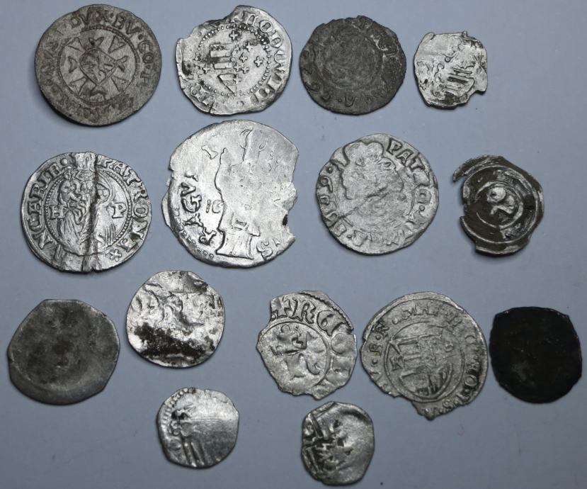 Lot 15 srednjeveških srebrnikov Madžarske Avstrije in Hrvaške Ragusa - Dubrovnik kovanih med leti 1100 in 1600. Kovanci so slabše ohranjeni, potrebni čiščenja, precej je delno poškodovanih, a z vseh se da razbrati kdaj in kdo ga je koval.