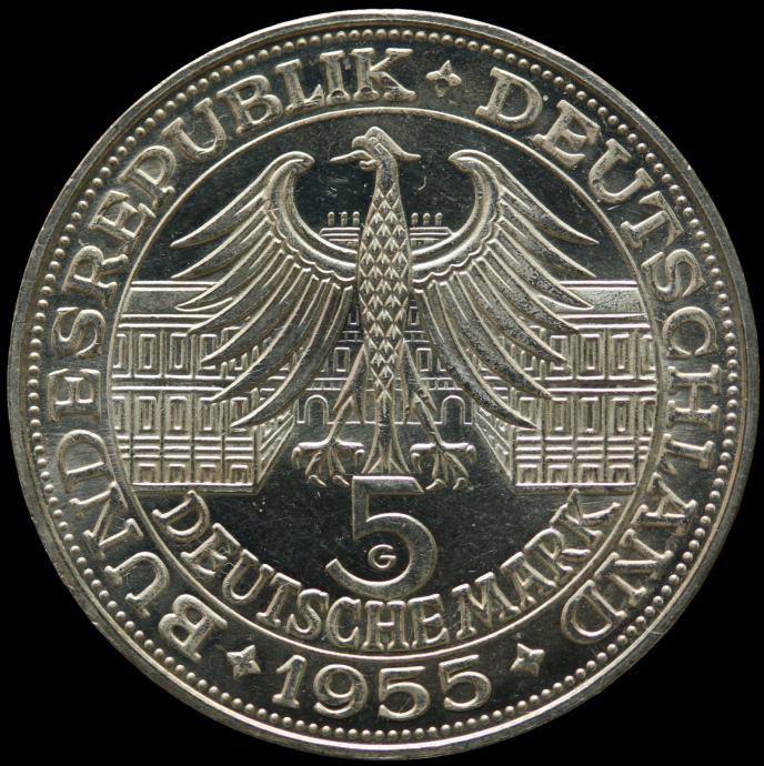 LaZooRo: Nemčija 5 Mark 1955 G Ludwig von Baden PROOF redek - Srebro
