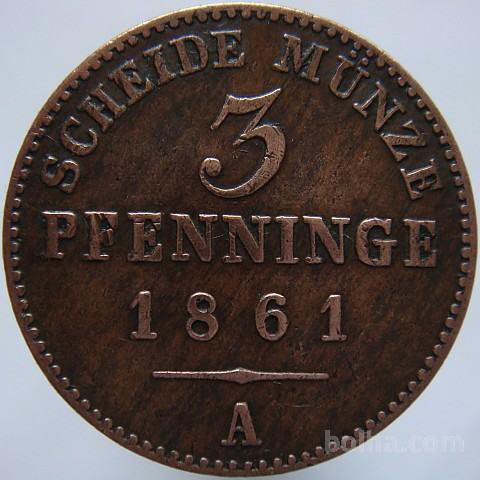 Nemčija PRUSSIA 3 Pfennig 1861 A aXF