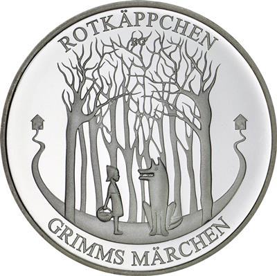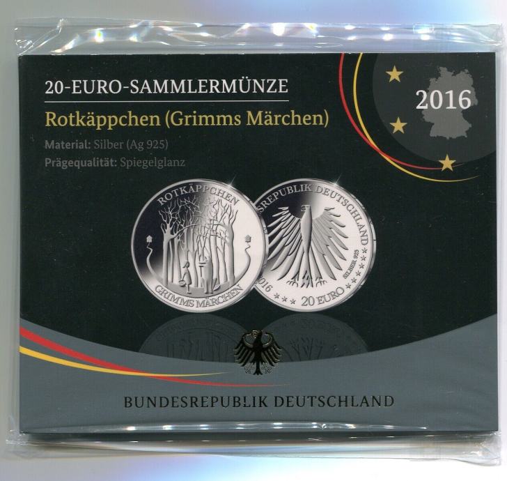 Iz lastne zbirke se prodaja nemški PROOF srebrnik iiz serije * pravljice bratov Grimm * - RDEČA KAPICA. Srebrnik je v originalni embalaži. Še vedno je kompletno zapakiran v plastičen ovitek, tako kot ob nakupu. Prva slika prikaziuje original, druga in tretja sta simbolični za boljši prikaz, kakšen je videti srebrnik v ovitku, kadar je ta odprt.