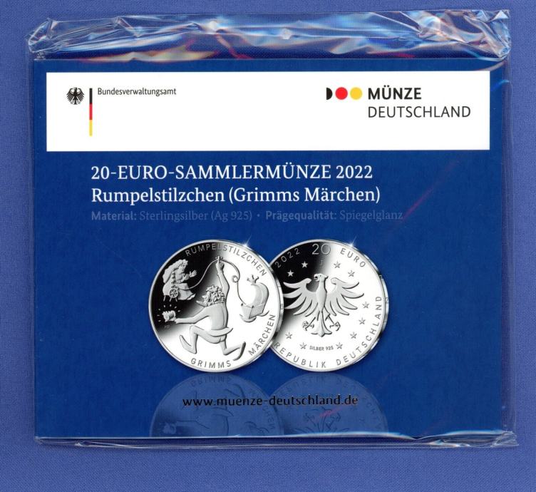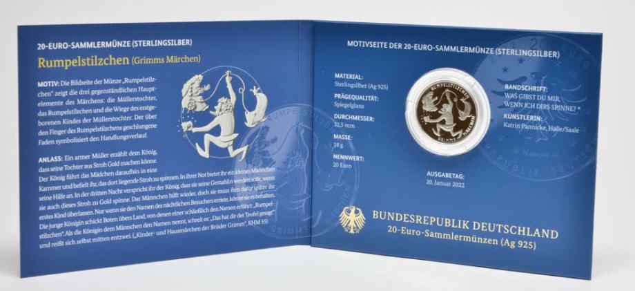 Iz lastne zbirke se prodaja nemški PROOF srebrnik iiz serije * pravljice bratov Grimm * - Špicparkeljc (Rumpelstilzchen). Srebrnik je v originalni embalaži. Še vedno je kompletno zapakiran v plastičen ovitek, tako kot ob nakupu. Prva slika prikazuje original, druga in tretja sta simbolični za boljši prikaz, kakšen je videti srebrnik.