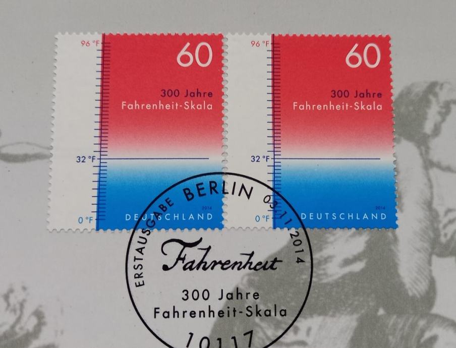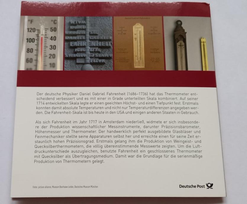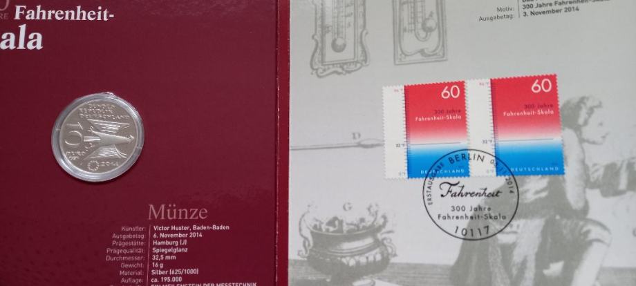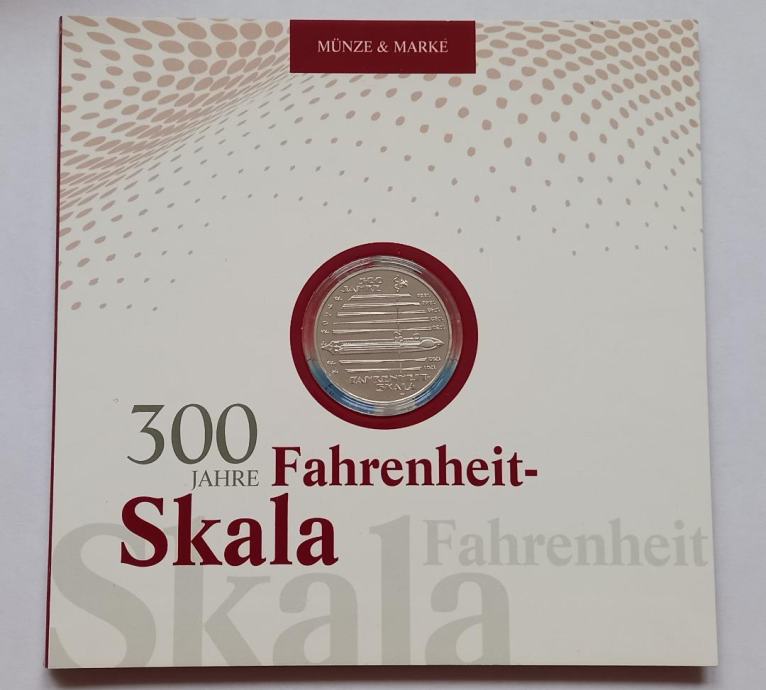 Prodaja se proof nemški srebrnik Fahrenheitova temperaturna lestvica v numizmatično filatelističnem ovitku. Dodani sta dve znamki izdani ob 300. obletnici izuma temperaturne lestvice.