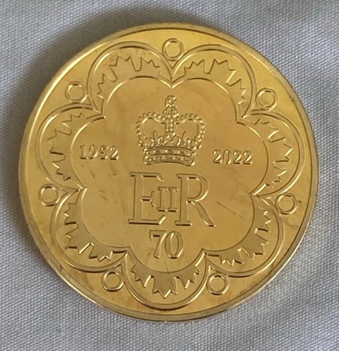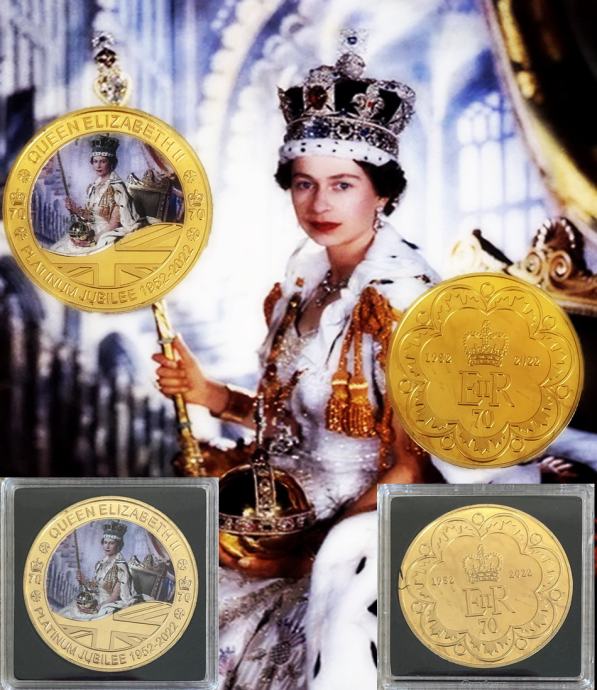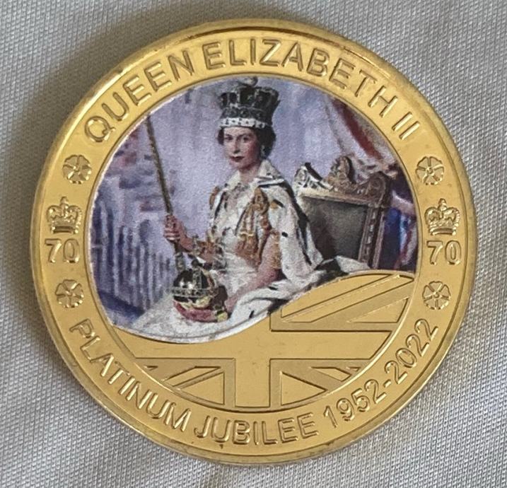 Angleška kraljica Elizabeta II 70 letnica . Spominska, zbirateljski kovanec .Zlata prevleka..kovanca ..