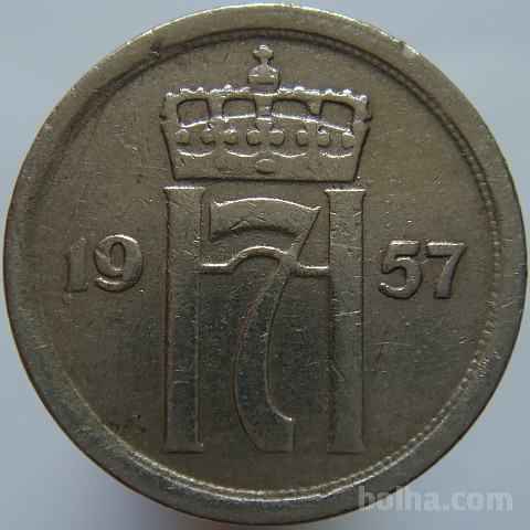 Norveška 25 Ore 1957 var PP myntmerket på plate (znak kovnice na plošči) VF
