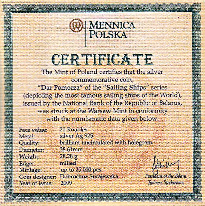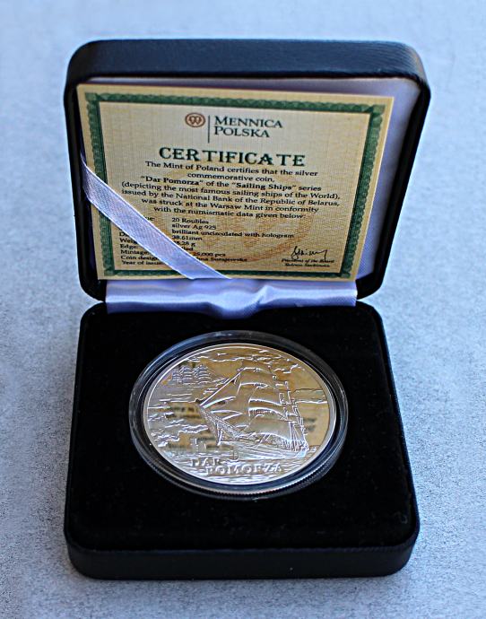 Srebrnik se nahaja v plastični kapsuli, ta pa v kovinskem etuiju, oblečenem z imitacijo usnja črne barve. Certifikat pritrjuje svilnati trak. Notranjost etuija je iz dveh vrst blaga in barv. Ležišče kovanca je v imitaciji črnega žameta, pokrov v imitaciji bele svile.