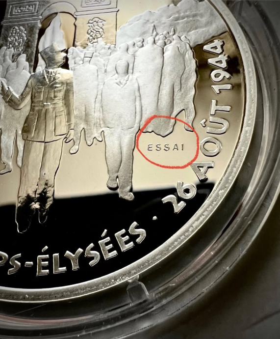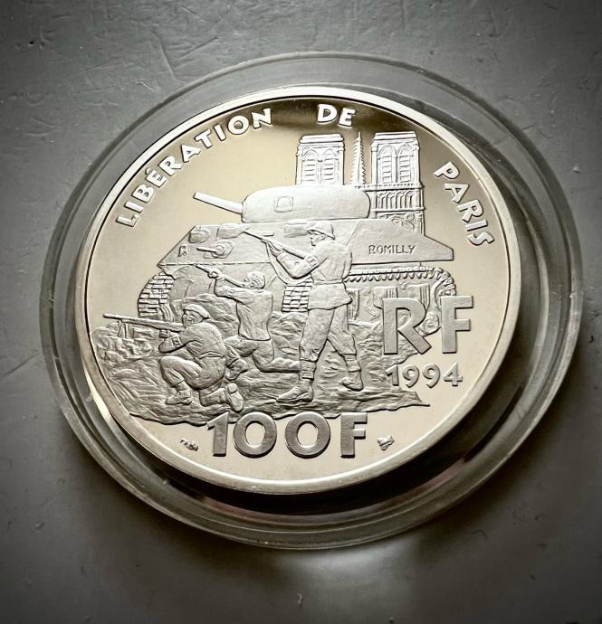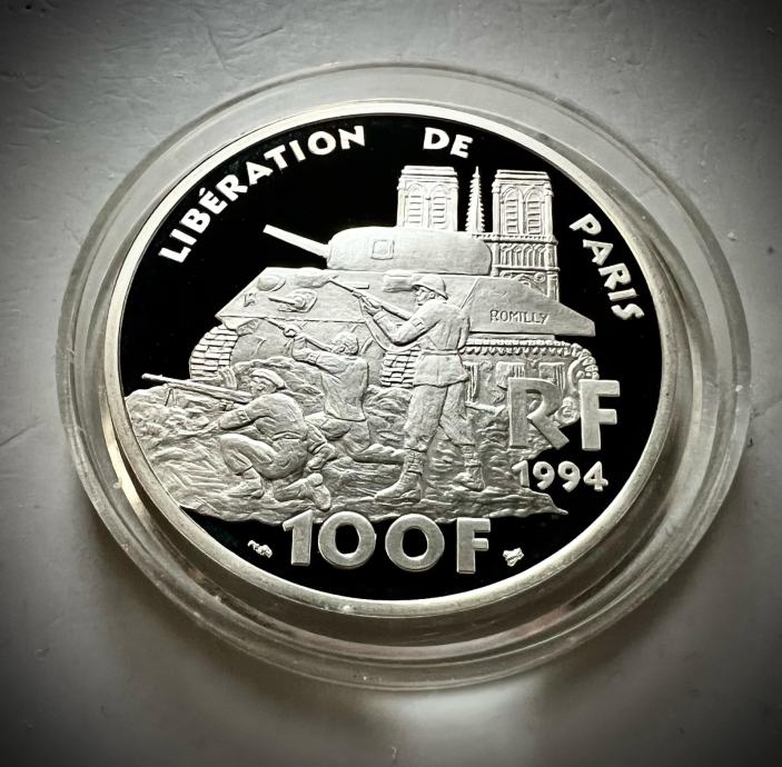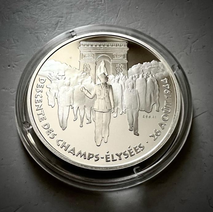 Francoski priložnostni srebrnik, kovan ob 50 obletnici ovoboditve Pariza izpod nemške okupacije leta 1944.