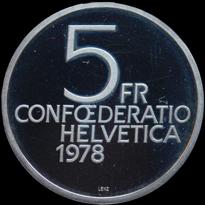 Švica 5 Francs 1978 PROOF redkejši Dunant