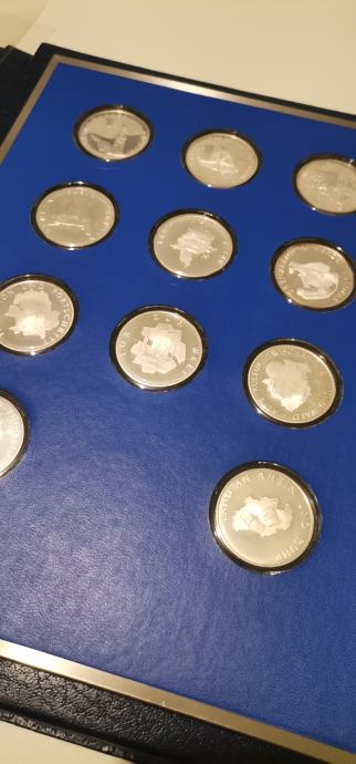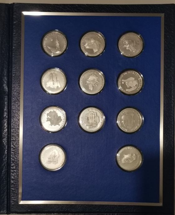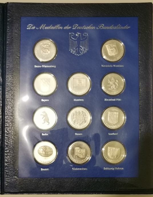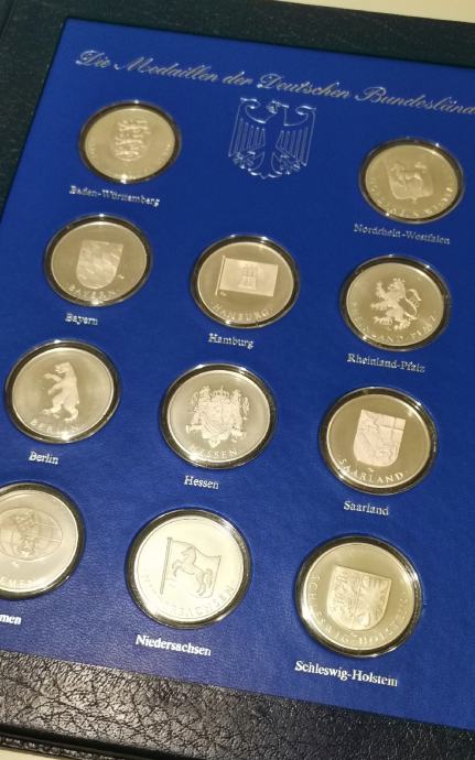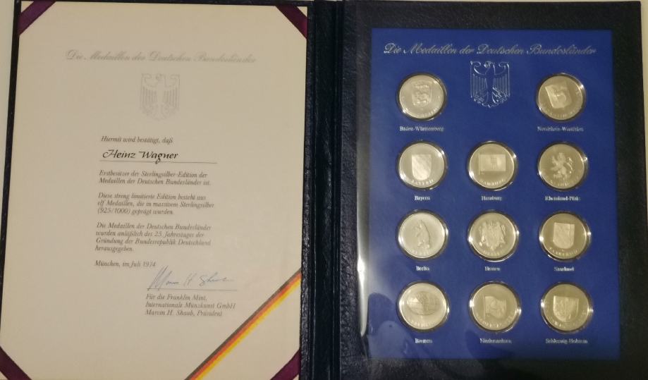 Zbirka srebrnikov nemških zveznih dežel iz leta 1974. Vsi srebrniki so v kapsulah, priložen je certifikat in knjižica. Vsak srebrnik je iz srebra 925/1000 in tehta približno 25 gramov, skupaj 275 g. Premer 38,6 mm. Skupaj je 11 srebrnikov »starih« zveznih dežel, spredaj državni grb z imenom zvezne države, zadaj geografski obris in zgradba/tehn. značilnost države.