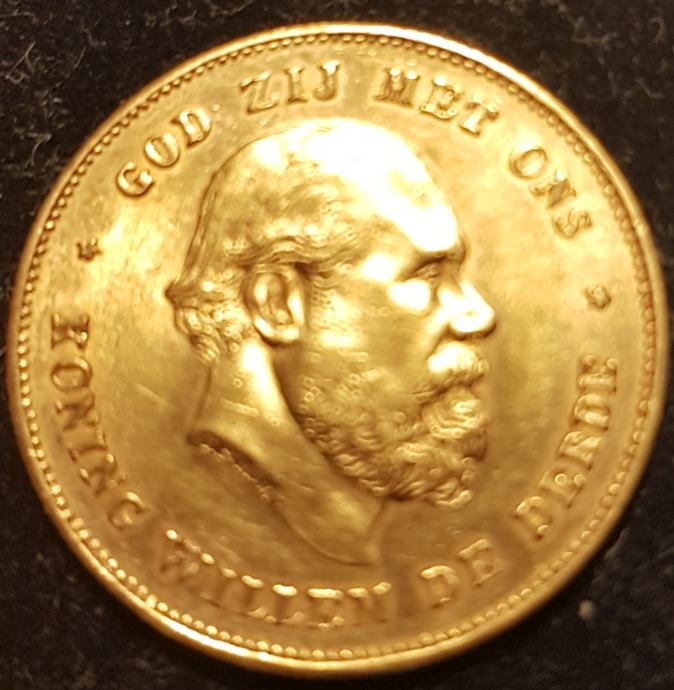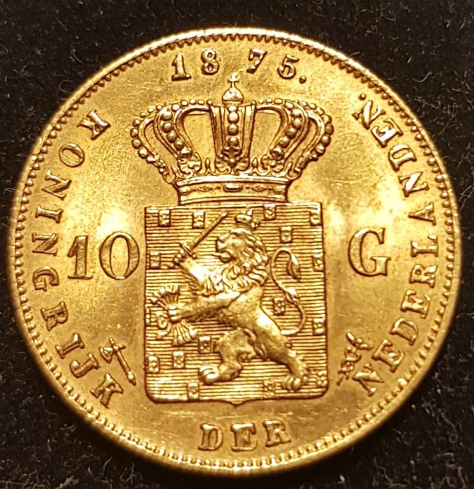 ZLATNIK 10 GULDNOV,KRALJ WILLEM NIZOZEMNSKA, LETNIK 1875,PREMER 22MM,UNC
