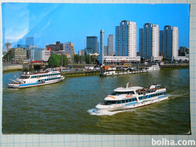 Razglednica ROTTERDAM. Rotterdam je pristaniško mesto in občina v nizozemski provinci Južna Holandija. Pristanišče Rotterdam je največje pristanišče v Evropi in drugo najbolj zaposleno na svetu. Mesto je bilo ustanovljeno ob reki Nieuwe Maas. Ime izhaja iz manjšega jezu na reki Rotte, ki se združi s Nieuwe Maas v središču mesta. Razglednica je zadaj malce poškodovana, ker je odlepljena znamka.