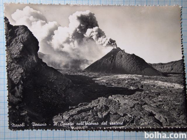 Razglednica VULKAN VEZUV, potovala 195?. Vezúv (italijansko Vesuvio, latinsko Vesuvius) je 1.279 m visok ognjenik ob obali Neapeljskega zaliva, približno 10 km vzhodno od Neaplja v južni Italiji.
