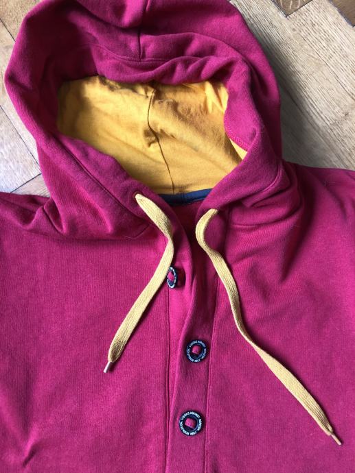 Samo parkrat nošen rdeč pulover iz čistega bombaža, kapuca znotraj oranžna, tudi trakec, trije gumbi ob izrezu, spodaj žep.