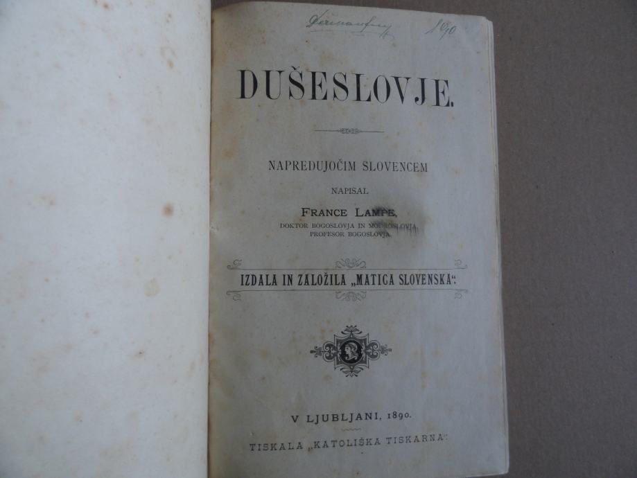 Knjiga DUŠESLOVJE, NAPREDUJOČIM SLOVENCEM SPISAL FRANCE LAMPE, MATICA SLOVENSKA 1890, trde platnice, dobro ohranjena.