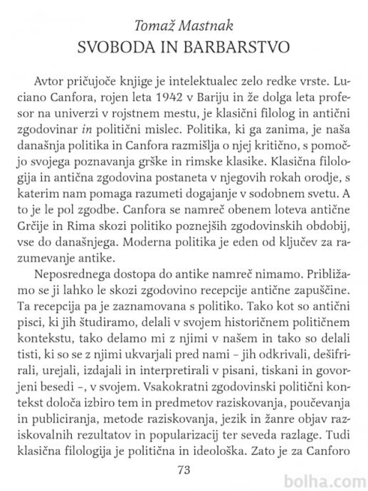Luciano Canfora je klasični filolog, ki ga je širše bralstvo spoznalo po knjigi Demokracija: zgodovina neke ideologije (Založba /*cf., Zbirka Delajmo Evropo). Canfora v zdaj predlagani poznejši knjigi prikazuje, kako so skoz zgodovino legitimirali osvajalne vojne pohode z utemeljitvijo, da ljudstvom, ki jih napadajo, v resnici »prinašajo svobodo«. Že stari Atenci so utemeljevali svoj imperializem z argumentom, da »zavezniškim« mestnim državam prinašajo »svobodo in demokracijo«. Pozneje so Lakedemonci v peloponeški vojni vodili protiatensko koalicijo, katere namen je bil, da prinese Helenom »svobodo«. Potem ko je Canfora obdelal klasične vzporednice, se loti modernih »osvoboditvenih« vojn. Prikaže Napoleonove vojne, sovjetsko zatrtje madžarske revolucije leta 1956, sovjetski poseg v Afganistan in naposled okupacijo Afganistana in Iraka pod ameriškim vodstvom. Knjiga je napisana duhovito in z veliko erudicijo ter s smislom za paradokse zgodovine. Ker je Evropska unija v zadnjem času obudila ideologijo »izvoza svobode«, bo prevod prišel v pravem času. Glede na to, da država Slovenija sodeluje pri dveh akcijah, ki ljudstvom menda prinašata »svobodo«, je vsekakor koristno, da se tudi tukajšnje občinstvo seznani z zgodovino dobrodelnosti te vrste. Luciano Canfora (1942) je klasični filolog, zgodovinar in oster polemik. Če se nisem zmotila v štetju, je doslej napisal 78 knjig s svojega širšega področja.