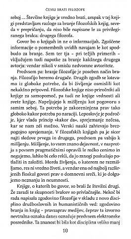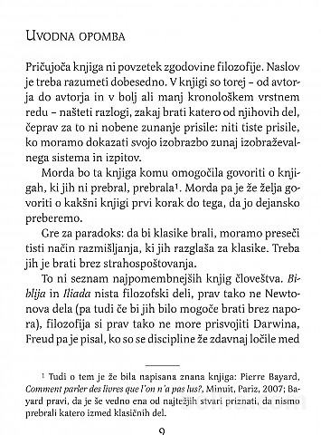 V knjigi, ni povzetek zgodovine filozofije. Naslov je treba razumeti dobesedno. Knjiga torej - od avtorja do avtorja in v bolj ali manj kronološkem vrstnem redu - našteva razloge, zakaj brati katero od njihovih del.
