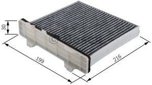 Filter kabine BS1987432426 (aktivno oglje) - Mitsubishi Grandis, Lancer, Outlander. Lastnosti: dolžina 216 mm, širina 199 mm, višina 30 mm.