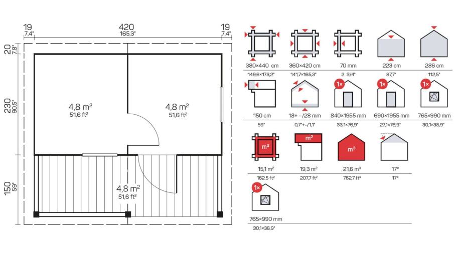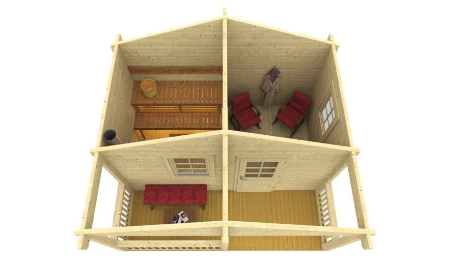 Komplet Maridinih lesenih savn debeline 70 mm vključuje naslednje: