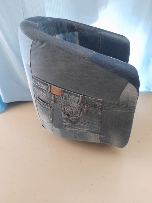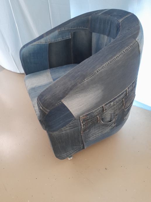 Prodam fotelj preoblečen v jeans v obliki podkve. Je zelo masiven in udoben. Je na kolesih. Višina do sedala je 47 cm do konca naslonjala pa 86 cm. Celotna širina fotelja je 80 cm, notranja širina sedala je 50 cm in notranja dolžina 60 cm. Prevzem v Slovenski Bistrici.