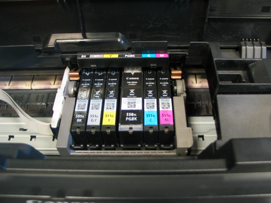 Vseh 6 originalnih črnilnih kartuš je vstavljenih v tiskalnik, razen sive, ki jo bi bilo počasi potrebno zamenjat, so vse napolnjene cca 75%.