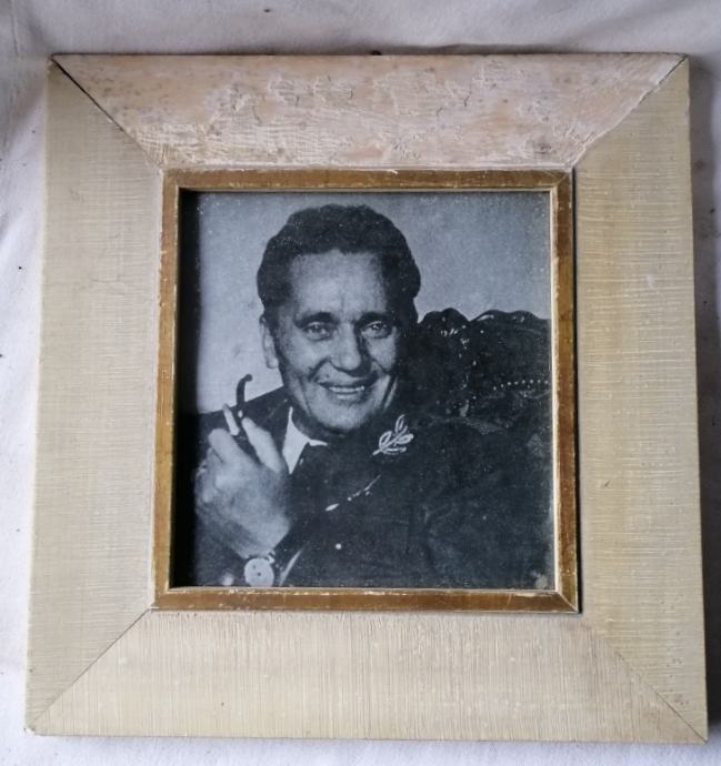 Na voljo je SLIKA črno-bela fotografija v poškodovanem okvirju s steklom 33,5 x 35 cm PORTRET TITA S FAJFO.