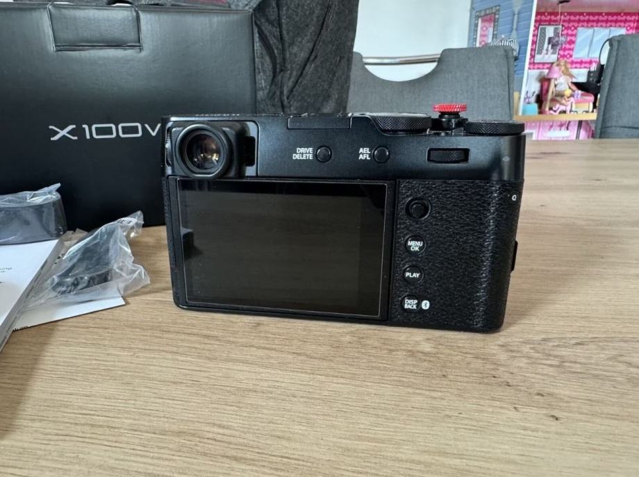 Fujifilm X100VI v elegantni črni barvi z originalno embalažo in veljavno garancijo. Fotoaparat je bil kupljen decembra 2024, uporabljan zelo malo — približno 1400 posnetkov.