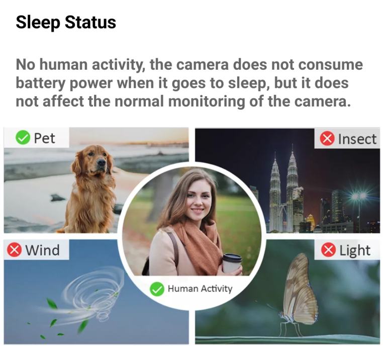 Za razliko od velike večine ostalih, tradicionalnih, kamer s klasičnim "motion detection" zaznavanjem gibanja vam ta kamera NE bo pošiljala na stotine lažnih alarmov o zaznavi gibanja, ampak vas bo na gibanje opozorila le takrat, ko bo to za vas tudi pomembno (alarm se na primer NE bo sprožil ob zaznavi premikajoče se veje, mimoidoči mačke, ptice, ali česarkoli drugega kot le in zgolj človeka).
