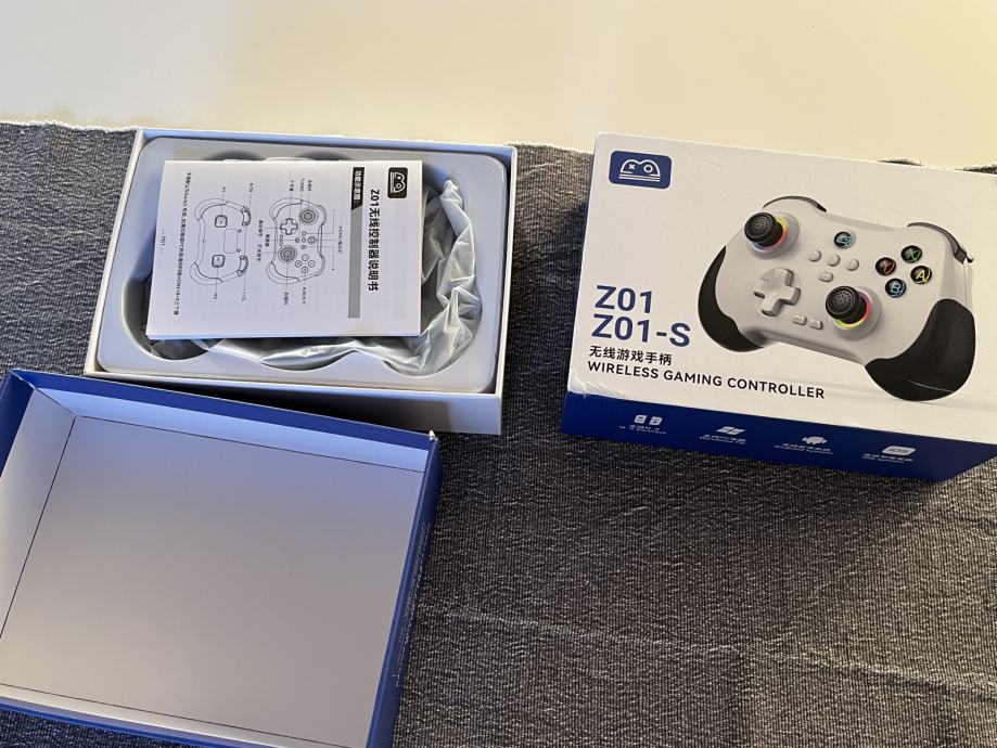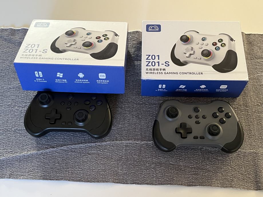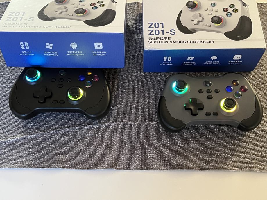 Dva Z01 brezžična (Bluetooth) kontrolerja v original embalaži. Kupljena na AliExpress, kompatibilna z Windows / Switch / Steam / Android / iOS. Praktično nerabljena - namen je bila uporaba z Linux-om, vendar mi ne uspe obdržati stabilne BT povezave. (Po izklopu se ne več avtomatično povežeta z računalnikom, potrebno je ponovno uparjanje. Z Windows-i naj ne bi bilo teh težav.)