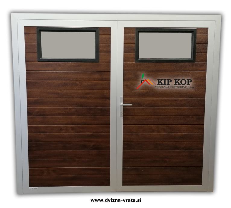Okvir dvokrilnih vrat je iz eloksiranega aluminija, ki je prašno barvan v približek barve panelov.