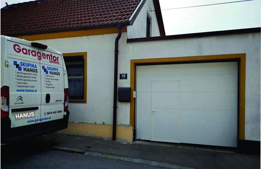 Popolnoma nova sekcijska garažna vrata HANUS Premium dimenzije 2380 x 2120 z vgrajenim osebnim prehodom. Barva : BELA