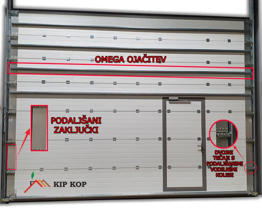 Zaradi velike širine vrat so v ceno tudi vključene omega ojačitve in set dvojnih tečajev s podaljšanimi vodilnimi kolesi ter podaljšani zaključki panelov!