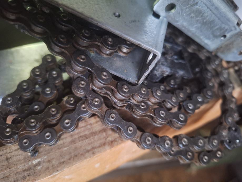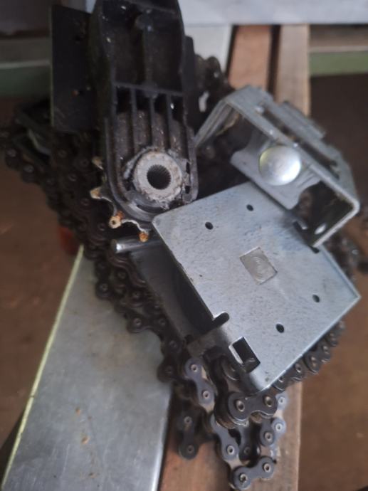 Komlet mehanizem za premik dvižnih vrat za garažo z verigo kolesi pogoskim zobnikom blokado in varovalom za ročni premik, cena kompleta je 15 euro.
