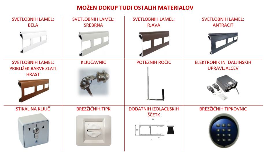 Ponujen je material za izdelavo navojnih garažnih vrat s tipkalom v kit kompletu (REFUZI) kar pomeni, da je predviden le za mojstre in podjetja kateri imajo urejen proizvodni proces. Nakup ni primeren za amaterje posameznike!