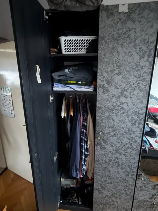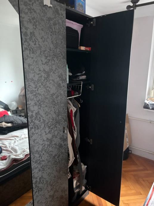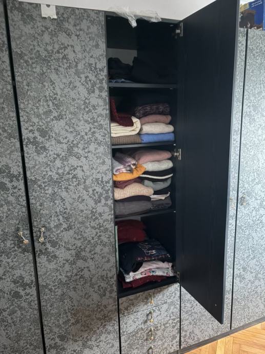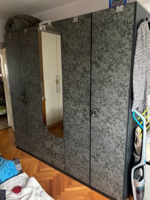 Za simbolično ceno oddam garderobno omara široka 214cm, visoka 219cm in globoka 60cm. Police in obešala razvidni iz slik prav tako ožji srednji del s štirimi predali in štirimi policami, ima pa lepotno napako, počeno ogledalo.