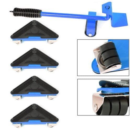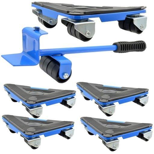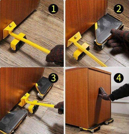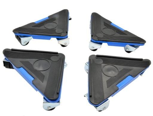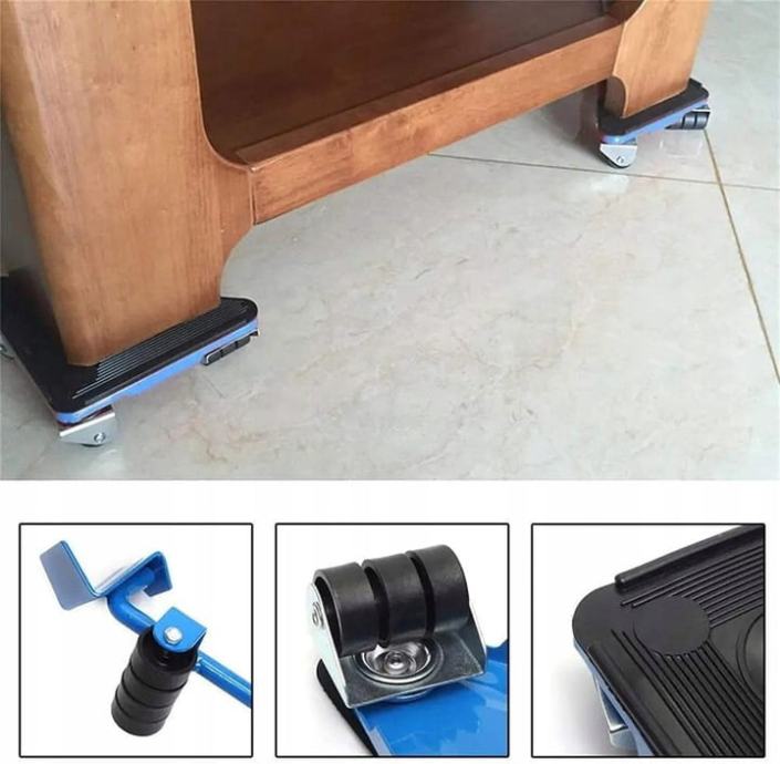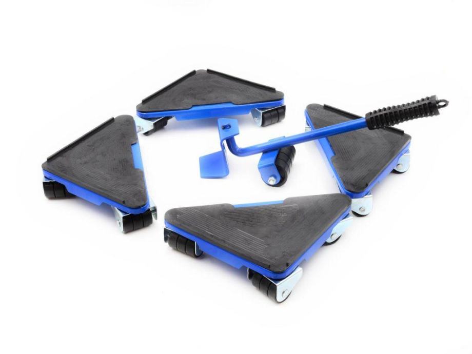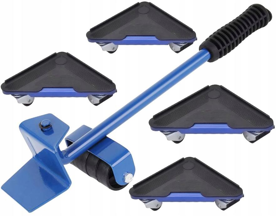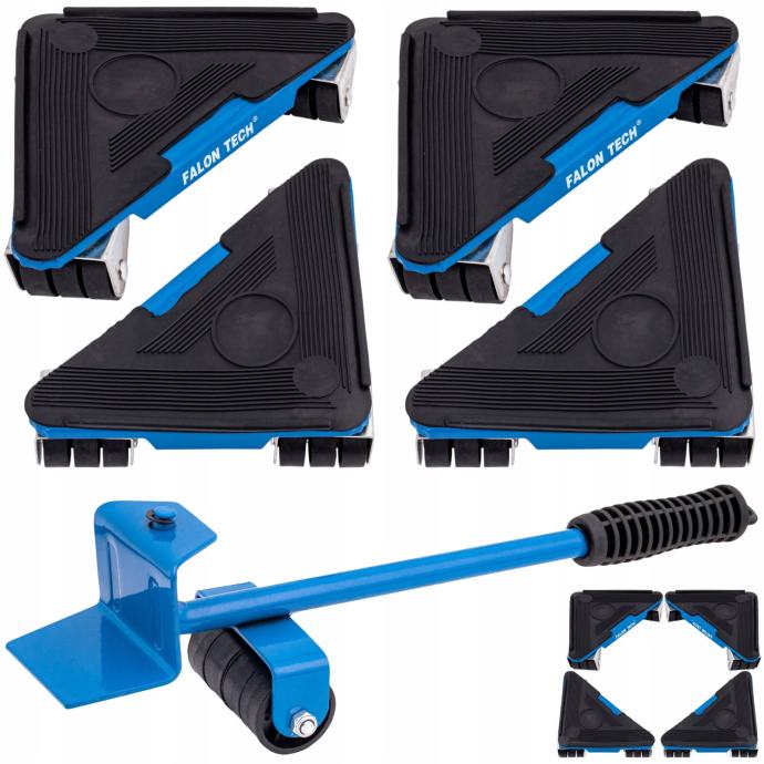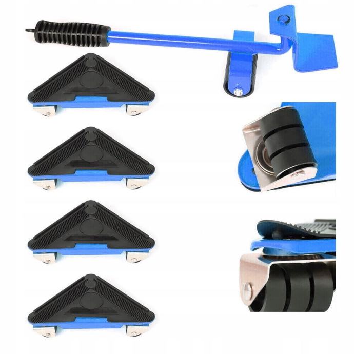 Transportna garnitura s 4 kolesi in ročko za dvig pohištva je idealna za udobno premikanje težkega pohištva in dvižna vrata. Kovinska stojala z valji, obložena z gumo, namenjena transportu in postavljanju pohištva ali drugih tovorov do teže 300 kg. Jeklena ročica se uporablja za dvig tovora pred vstavljanjem podstavkov.