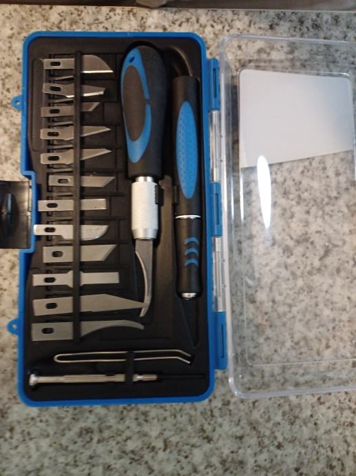 Garnitura modelirnih nožev z zamenljivimi rezili je namenjena rezbarjem, rokodelcem, modelarjem in umetnikom. Rezila so shranjena v prozorni plastični škatli.