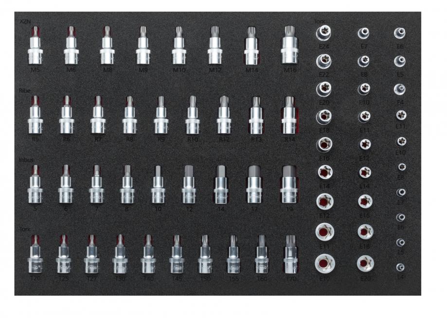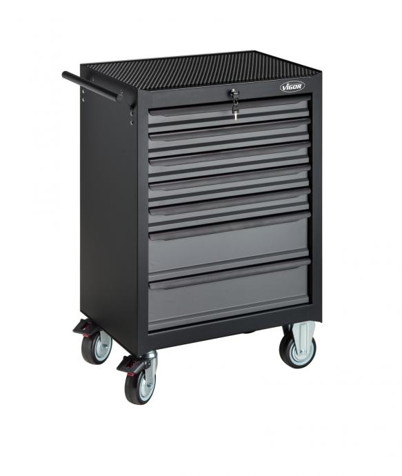 Voziček s sedmimi predali. Pet nizkih predalov in dva globoka predala. Štirje predali napolnjenih z orodjem. Trije predali prosti za dodatno orodje.