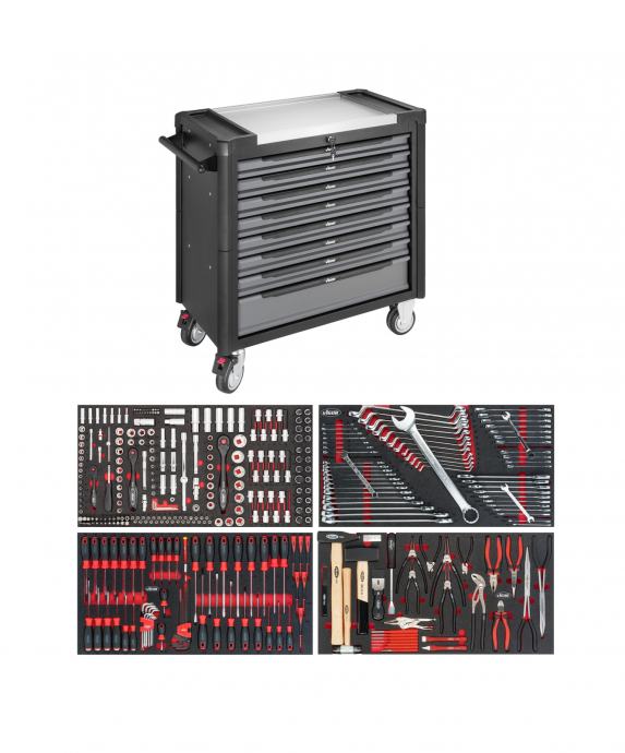 Vigor V4481-X/375 voziček napolnjen s kvalitetnim ročnim orodjem – 375 kosov orodja v vozičku, inox zgornja plošča vozička.