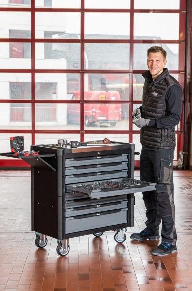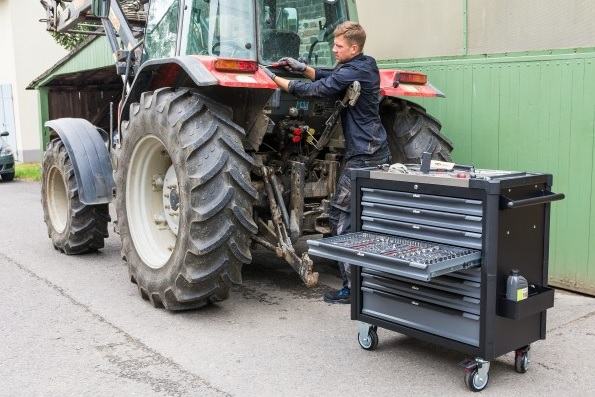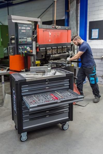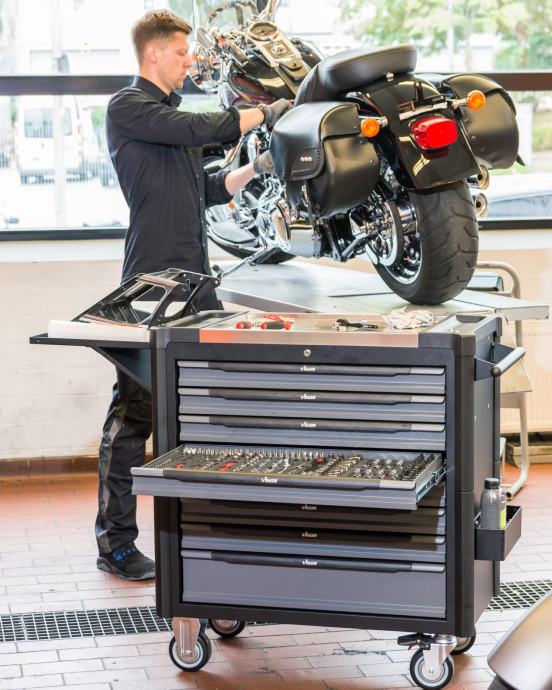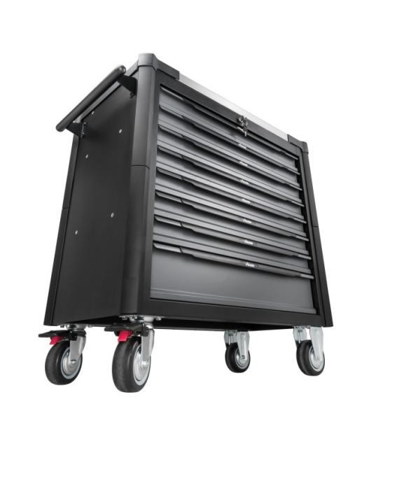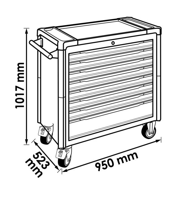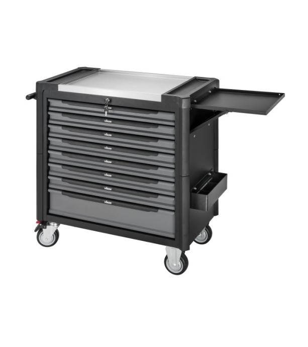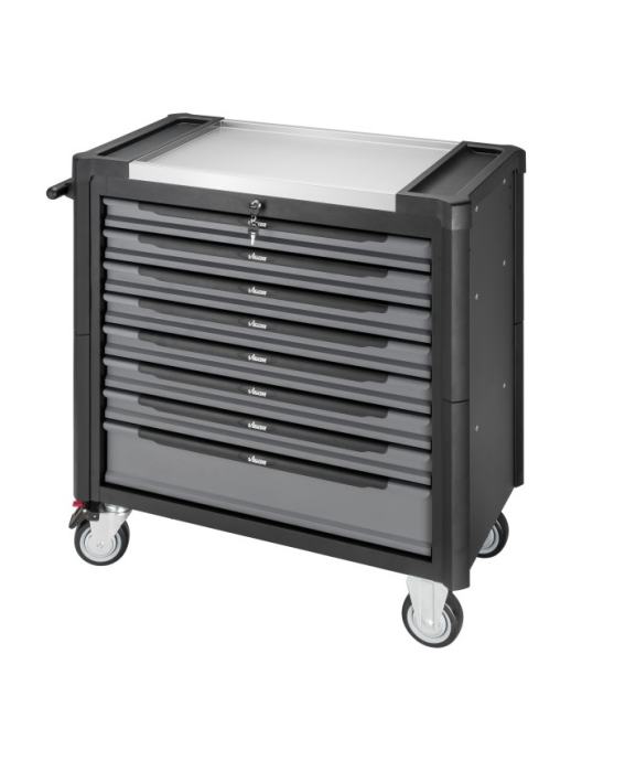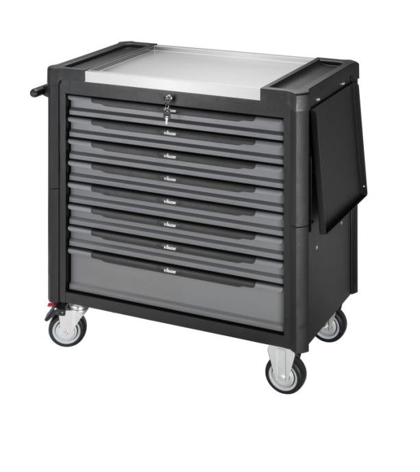 Voziček z osmimi predali. Sedem plitvih predalov in en globok predal. Sedem predalov napolnjenih z orodjem. En predal prost za dodatno orodje.