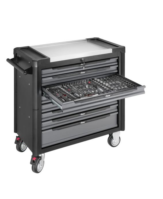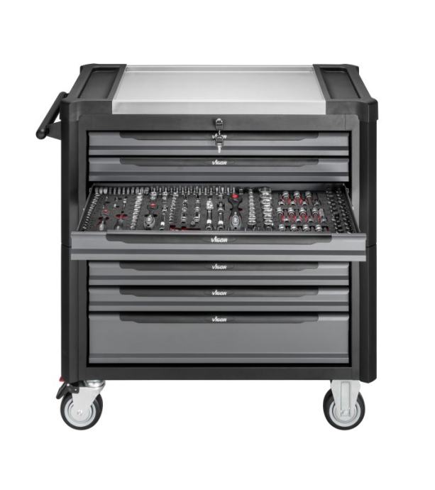 Vigor V4481-X/499 voziček napolnjen s kvalitetnim ročnim orodjem – 499 kosov orodja v vozičku – inox zgornja ploskev